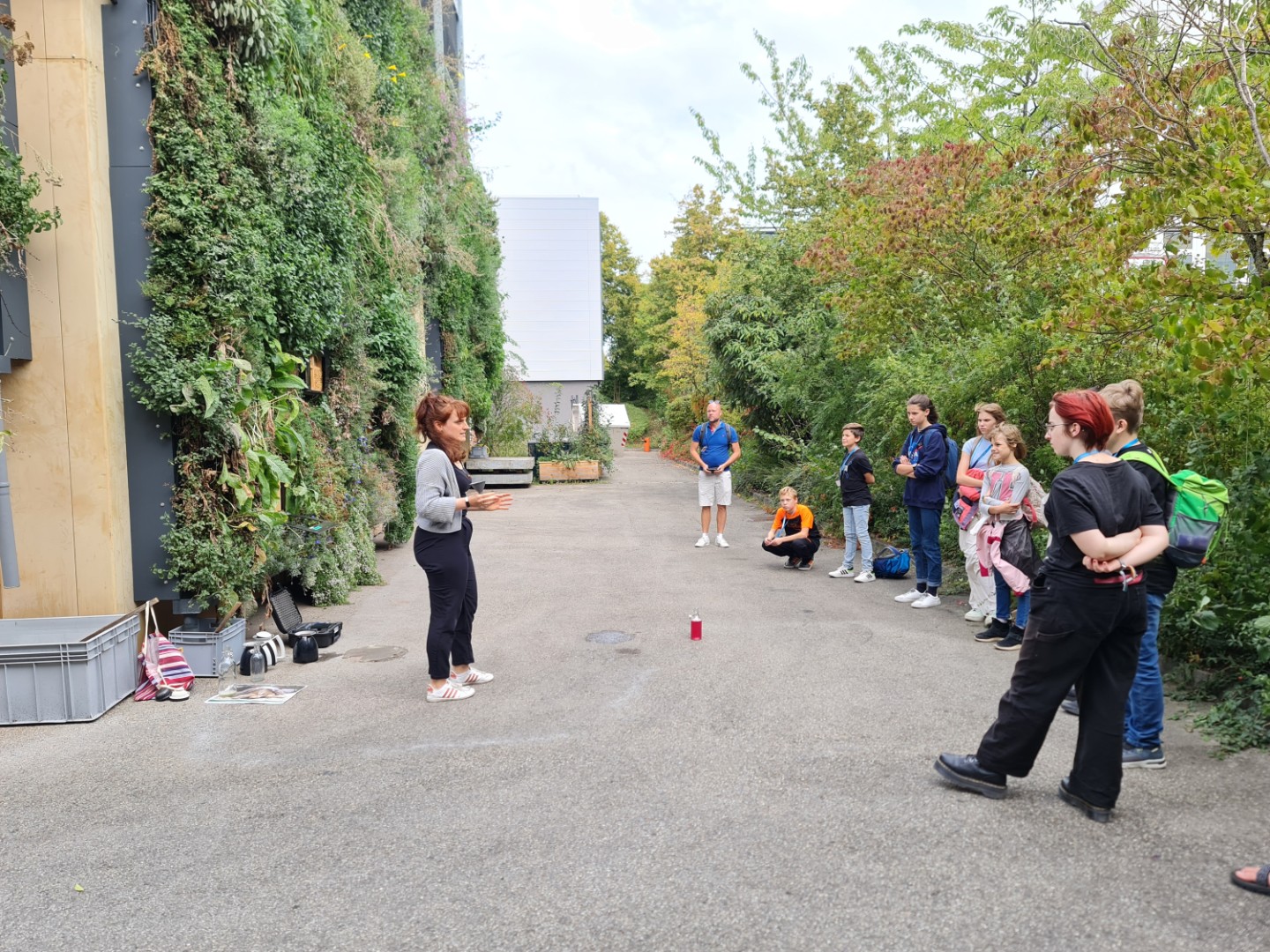 Wilde Klimawand als Heimat für Insekten und zur Kühlung des Stadtklimas: Eine besonders faszinierende Station war die Wilde Klimawand des IBP. Hier erfuhren die Kinder, wie wild begrünte Wände in Städten dazu beitragen können, das Klima zu verbessern und Lebensraum für Insekten zu schaffen.