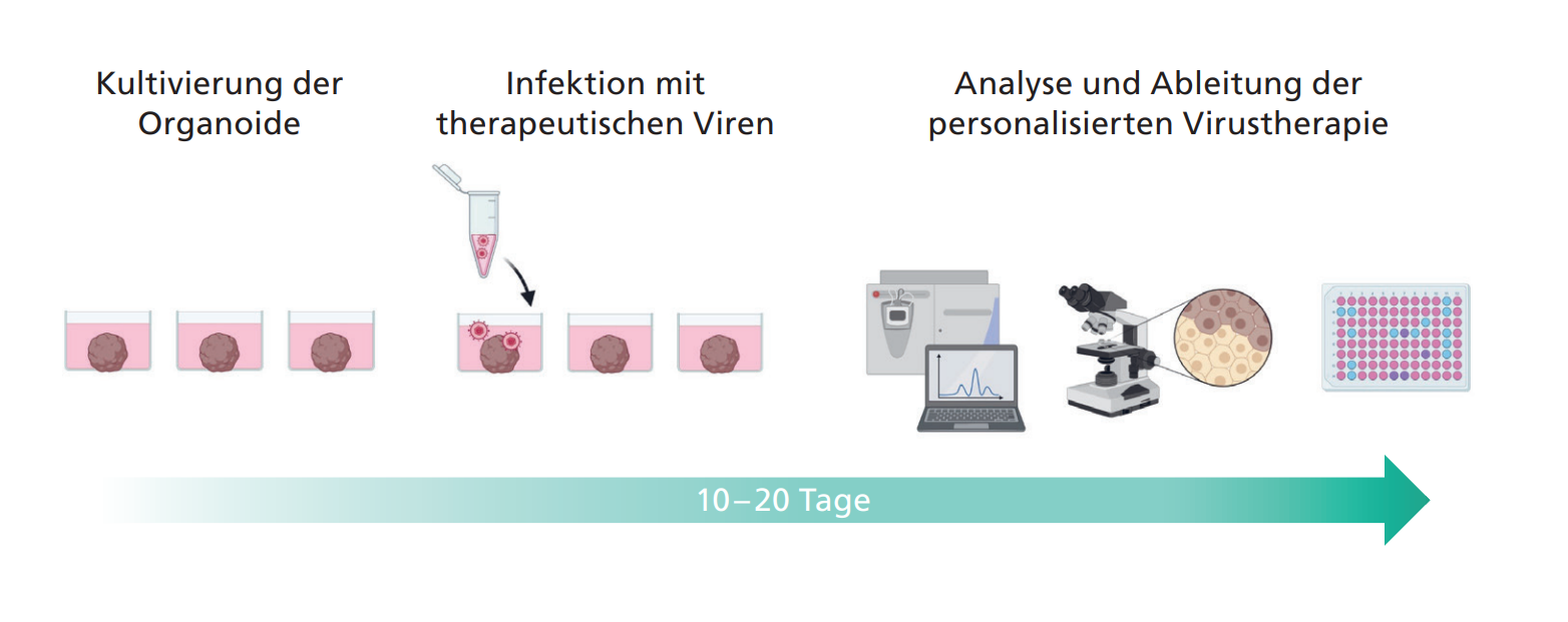 Organoide stellen innovative präklinische 3D‑Testsysteme für die Virotherapie dar, die durch Verwendung von Patientenmaterial (patient-derived organoids) in Zukunft sogar eine personalisierte Testung erlauben. Mit KinVOid wurden erste Schritte hin zur Entwicklung eines einfachen, kostengünstigen und massentauglichen Plattformverfahrens zur Testung therapeutischer Viren gemacht. Basierend auf einer herpesviralen Infektion von neuronalen Organoiden als Modell soll die Kinetik der Virusinfektion von (Tumor-)Organoiden mithilfe einer Inline-Proteomanalyse in Kombination mit viralen Nachweisverfahren abgebildet werden.